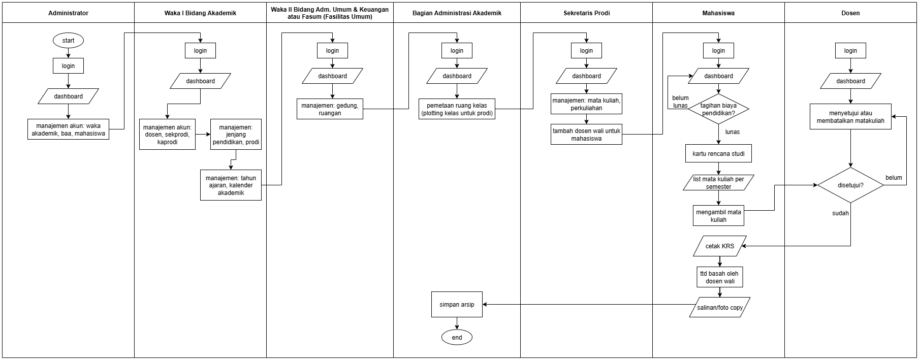 Setelah semua persiapan oleh Administrator, WAKA 1, BAA, dan Sekretaris Prodi selesai, alur pengisian KRS oleh mahasiswa dapat dimulai.